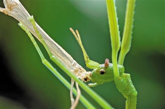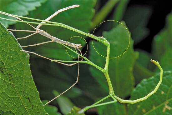 它的头,最后从旧的皮囊中挣脱出来。也许是太累了,也许是对蜕下的皮还念念不舍,它没有立即离去,而是深情款款地亲吻了一下自己刚蜕下的皮(图①)。这是一次庄严的告别,这也是一次蜕变式的成长。在竹节虫短暂的一生中,一般将历经三至六次的蜕皮,每一次蜕皮,都是与旧“我”的告别。