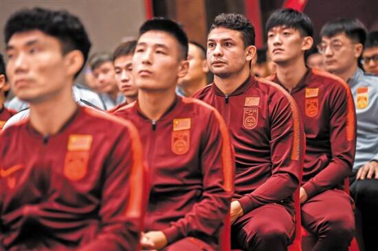 艾克森(左三)、武磊(左二)、郑智(左一)、颜骏凌等在誓师大会上 新华社发