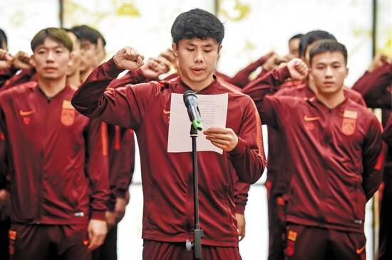 新任国家队队长蒿俊闵(前)带领队友面向国旗宣誓 新华社发