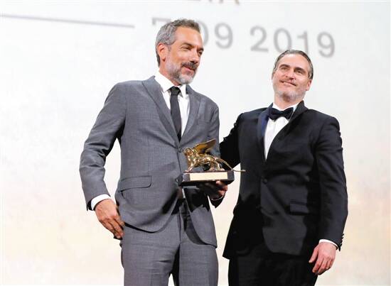 《小丑》导演托德·菲利普斯与男主角杰昆·菲尼克斯(右)登台领奖
