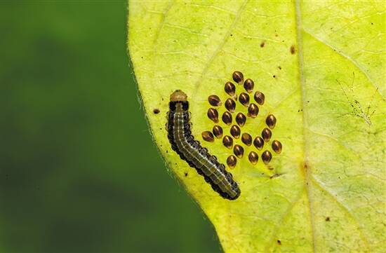 《路过》 (毛毛虫从盾肩普缘蝽的空卵旁经过)