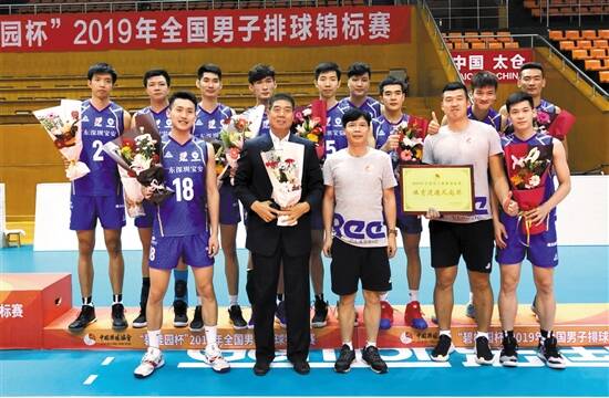 羊城晚报讯 记者苏荇报道:广东深圳宝安明金海排球队日前夺得2019年全国男子排球锦标赛季军(上图),这是时隔42年后再次有广东队伍回归全国男排前三甲行列。昨晚,球队庆功会在明金海宝立方中心举行,全体队员和教练获得深圳明金海集团10万元奖金鼓励。