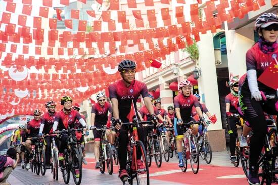 江门,慢骑快闪,骑行队列经过国旗下的步行街 江门日报特约摄影师 冯耀华 摄