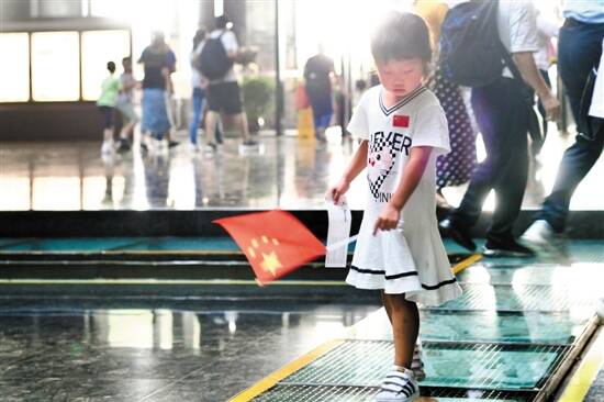 10月3日,广东省博物馆迎来大批观众。不少人在观展时还带上了五星红旗,喜庆氛围浓厚 羊城晚报记者 梁喻 摄