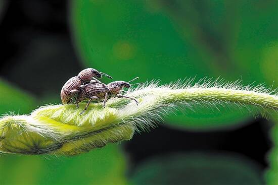 摄/刘海春 文/孙道荣象甲虫,俗称象鼻虫,已知种类5万多种,遍及全球,一度成为动物界最大的科。为什么它们的族群如此强大?其中的一个主要原因,就是源于其旺盛的繁殖力。