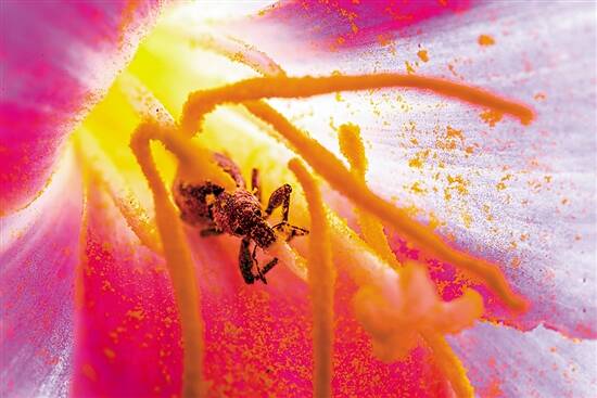 一只象甲(图3),醉卧在韭菜兰的花蕊之中,它的全身,沾满了粉黄色的花粉,多么像一个喜庆的、幸福的、心满意足的新娘子!我不能确定,这只象甲虫,是不是前面的某一只,它们长得如此相像,难以分辨。摄影师告诉我,这不是在同一地点,也不是同一时间拍摄,因而,可以断定,它们可能不是同一只(对)。这反让我释然,我终于明白,爱情可以在任何时间、任何地点、任何一对象甲虫之间发生。在不经意的某片树叶上,可能正在发生着另一场象甲虫的爱情故事,就像在我们身边,随时萌发的人类的爱情一样。