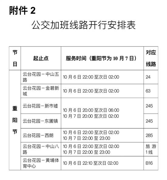全市共15个登高点向市民开放,其他登高地区实施封山,谢绝游客上山。开放登高点中有部分登高点6日夜间不开放。此外,将有7条公交线路加班(详见下图)。
