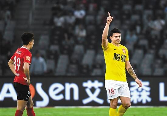 广州恒大队球员艾克森在比赛中庆祝进球 新华社发