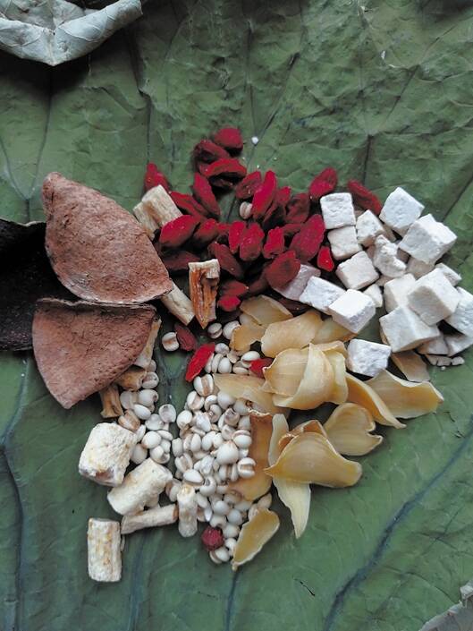 烹制方法:各物洗净,母鸡切块,放入沸水中焯水;上述食材一同放入锅中,加清水2000毫升(约8碗水量),武火煮沸后改文火煲1.5小时,放入适量精盐调味即可。此为2~3人量。