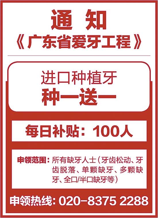 “广东省爱牙工程”派福利:缺牙市民10月拨打020-8375 2288可申领进口种植牙种一送一,享平均临床经验超15年博硕学位专家亲诊,预约到院免挂号费、专家会诊费、种植方案设计费!