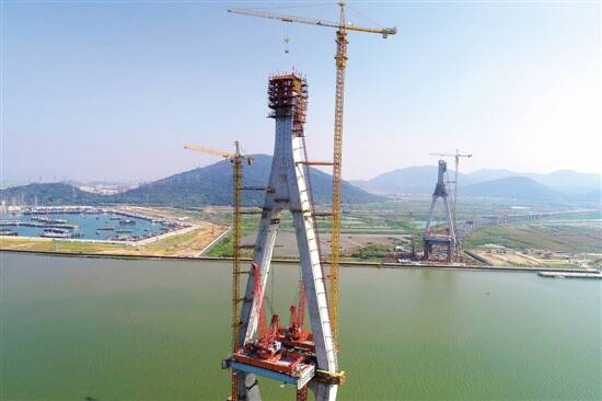 图片新闻羊城晚报讯 记者郑达,通讯员孟庆虎、张政摄影报道:8日,珠海洪鹤大桥最高的主塔(168.484米高)顺利封顶。至此,洪鹤大桥4个水滴形主塔全部施工完成,大桥的上部结构施工全面展开,进入冲刺阶段,为明年珠海航展前通车打下了坚实基础。