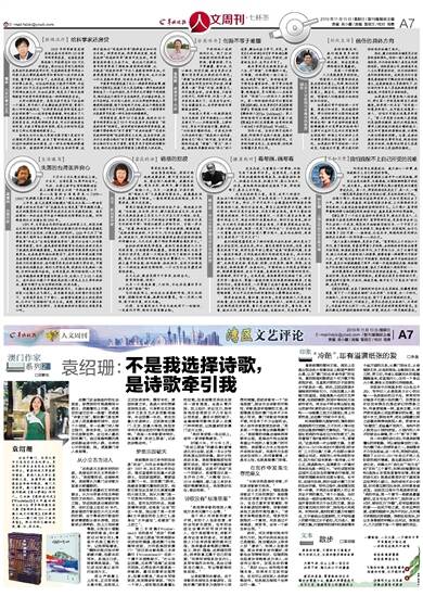 “在我读天主教学校的时候,我曾经祈求天主畀我做个诗人。”袁绍珊笑说。在海峡两岸,袁绍珊认为澳门在诗歌方面是比较耀眼的。
