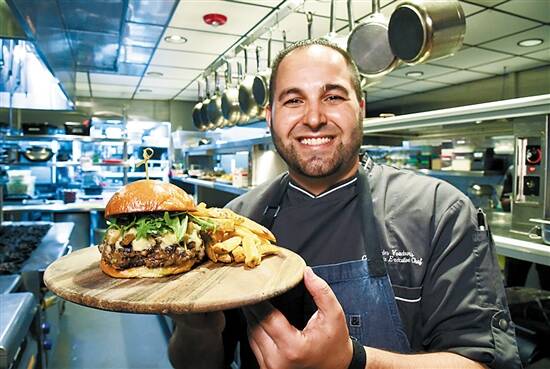 洛杉矶一家餐馆的主厨查尔斯·凡多斯展示新品汉堡包