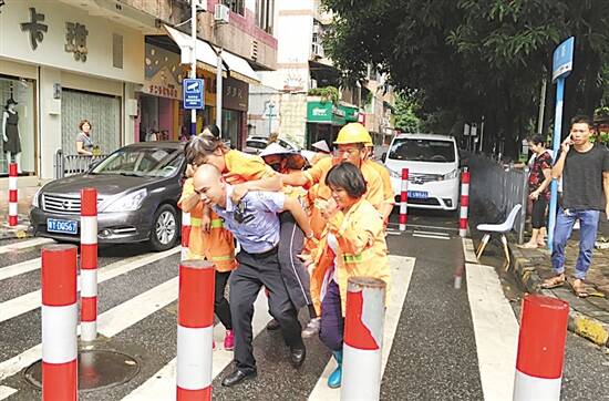 ▲梁炳坤背起晕倒的环卫工阿姨赶往医院
