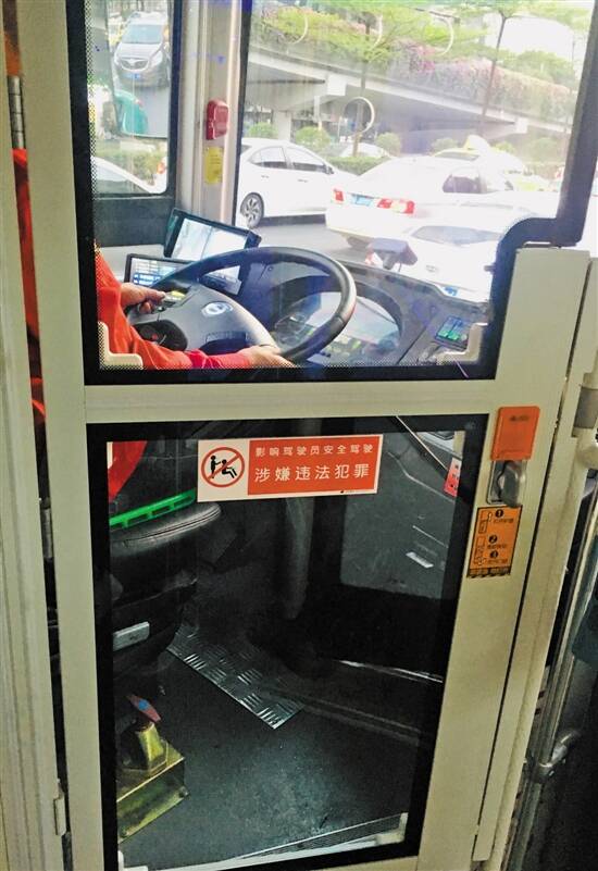 近日,羊城晚报记者发现广州部分线路的公交车辆上,司机驾驶区域安装了一米多高的玻璃隔离门,并配有门锁。