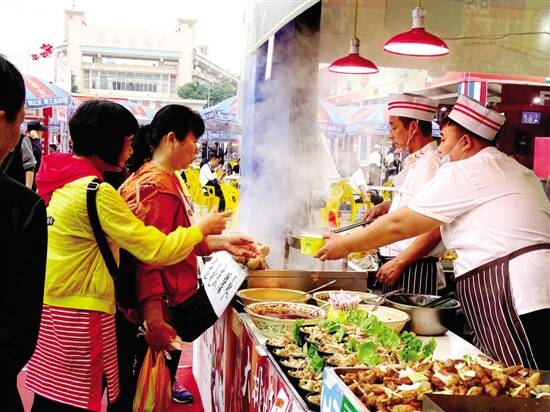 “美食+”的元素处处可见。例如 “美食+文创”,在美食节现场举办“岭南古邑·粤韵番禺——2019番禺全域旅游文化创意产品设计大赛”获奖作品展,展示番禺文商旅高度融合发展和全域旅游创建成果;“美食+非遗”,美食节现场设立“广府非遗美食体验区”,展示广州市食品类非遗产品,有水黄埔菠萝粽、成珠楼小凤饼、广式凉果、吴财记的云吞面、传统白斩鸡、水菱角、广式拉肠等非遗美食。另外,美食节期间每天举办“非遗美食体验活动”,市民可以亲身体验非遗美食的制作过程。