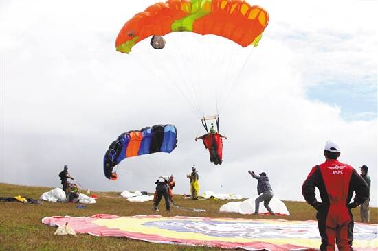 翼装飞行挑战者落地仍需要借助降落伞。图为2016年9月在云南举行的国际翼装飞行世界杯总决赛上的运动员准确落地。