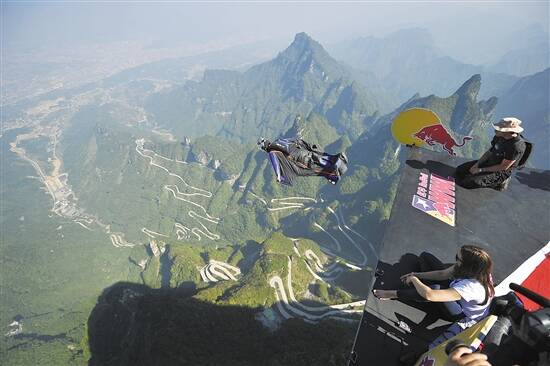 图为2015年10月17日,第四届红牛翼装飞行世界锦标赛上的“翼装侠”们。他们面前的赛道直线距离1700米、垂直距离600米,位于天门山大峡谷中心线上的“空中走廊”上。