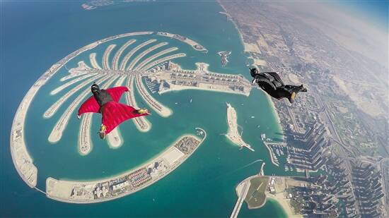 2015年5月12日,翼装飞行高手们飞越迪拜上空,遨游天地间俯瞰城市美景。