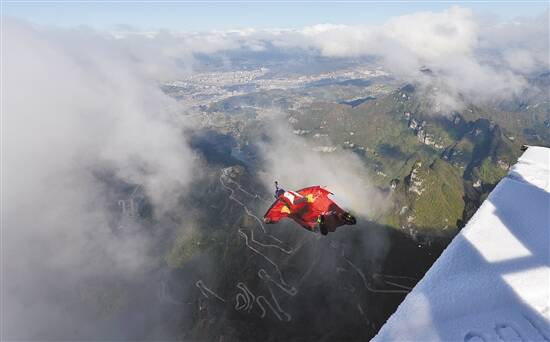 2015年12月6日,张家界天门山景区雪后初晴,有“亚洲翼装飞行第一人”之称的张树鹏在挑战穿越云雾,结果云海突然往两边散开,中间还出现五彩“佛光”,现场画面相当惊艳。