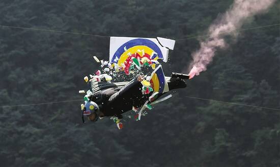 2019第八届翼装飞行世锦赛上,选手进行精准穿靶项目时的精彩一瞬。