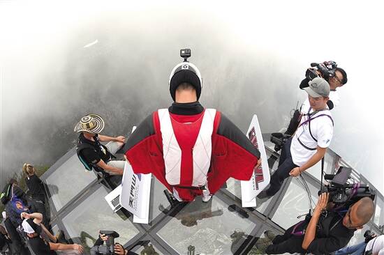 第七届翼装飞行锦标赛上,翼装飞行员在海拔1400余米的天门山玉壶峰起跳台上做飞行准备。
