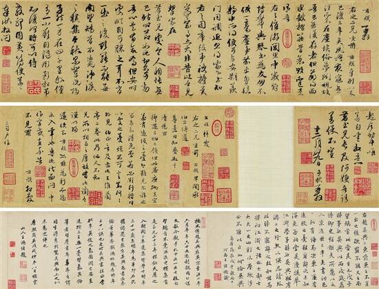 此次拍卖的《致郭右之二帖卷》含两通书札。此卷前一札称《奉别帖》,后一札称《应酬失宜帖》。二帖皆纸本,前帖高16.1厘米,长74.8厘米,约1.1平尺。行草书三十二行,因起首有“奉别”二字,故著录家皆称之为《奉别帖》。后一帖亦纸本,高16.1厘米,长38.8厘米,约0.6平尺,楷行相间。因札中有“此番应酬失宜”句,各家著录称之为《应酬失宜帖》。在这两通与郭天锡的往来信件中,赵孟頫所述包括自己当时的生活状况,以及两人间关于书画藏品的交流。而在今天的研究者看来,两通书札中可见赵孟頫接受元朝征召时,进退两难的复杂心理以及此后自己独处的孤独。