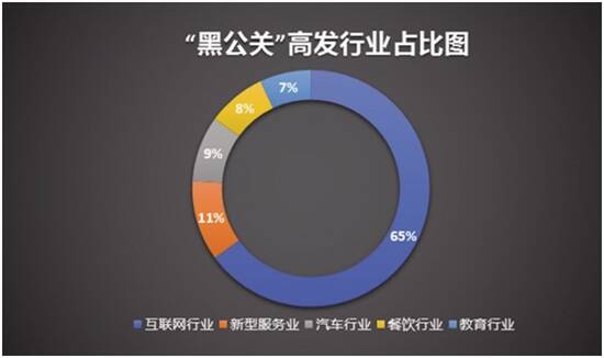 2019年以来,包括腾讯、美团、拼多多、360等在内的企业,均多次披露遭遇“黑公关”的详细情况。在报告重点分析的66个具有典型“黑公关”特征的案例中,来自互联网行业的占比高达65%,其他行业中,新型服务业占比11%、汽车行业占比9%、餐饮行业占比8%、教育行业占比7%。