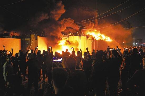 据新华社电 伊拉克安全官员27日说,数十名示威者当天傍晚冲进伊朗驻伊拉克什叶派圣城纳杰夫领事馆,并对领事馆建筑纵火(上图)。
