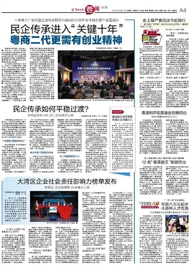 昨日上午,《我是粤商创二代——中国民营企业传承样本》新书发布会暨粤港澳大湾区企业社会责任影响力榜单发布在羊城创意产业园举行。由羊城晚报社联手商道纵横发起的“2019粤港澳企业社会责任影响力榜单”对外公布,共29家企业分获四个维度的影响力企业称号。