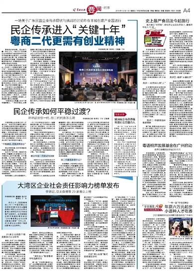 大湾区企业社会责任影响力榜单发布 李锦记、亚太森博等29家粤企上榜 2019年12月01日 要闻·时事 戴曼曼、行欢、陈泽云、丁 玲