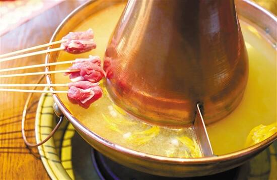 区别于汤底讲究的广东“打边炉”和浓油重辣的四川火锅,老北京涮羊肉讲究的是传统清水涮锅,而且一定要用全铜锅。锅的大小、铜的厚薄决定了锅的受热程度,也决定了涮羊肉的口感。“奇门”从北京开到广州,铜锅也从北京带到了广州。一起来的还有老北京涮羊肉的关键——麻酱。在传统麻酱的基础上,“奇门”用老鸡、棒骨和20多种中草药熬制出高汤汤底,再加入金华火腿、虾仁、咸鱼等配料,鲜味远胜传统麻酱。