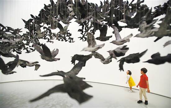 ▲ 今年5月在澳大利亚墨尔本展出的中国当代艺术家蔡国强的艺术作品《鸟云》,以1万只陶瓷制成的椋鸟铺满大半个展厅。艺术家旨在以此与同期展出的秦兵马俑《永恒的守卫》相呼应,讨论看不见的世界。