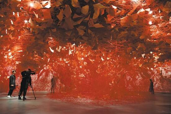 ▲ 今年11月,《无界之归——2019杭州纤维艺术三年展》上,艺术家用大红纤维条制作的装置艺术,反映出当下全球范围内纤维艺术创作的新动向。