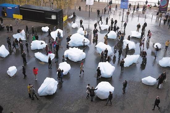 ▲ 去年12月在英国伦敦市中心展出的以冰块为主题的装置艺术展,让游客们可以近距离围观正在融化的“冰川”,旨在让更多人关注气候变化,提高环保意识。