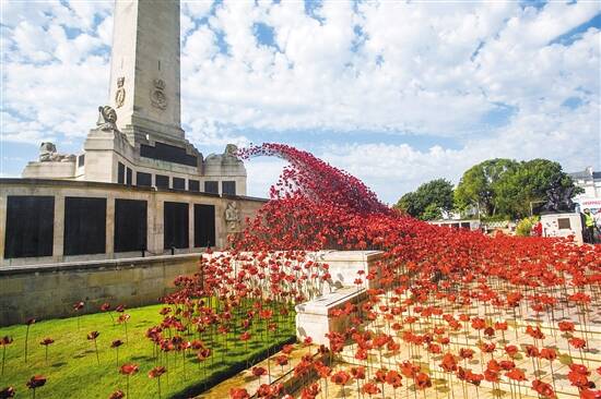 ▲ 2017年8月在英国普利茅斯GWGC海军纪念馆举办陶瓷罂粟艺术装置展览,数千朵陶瓷罂粟从纪念馆高处倾泻而下。红罂粟已被艺术家专门用来纪念在战争中牺牲的军人和平民。