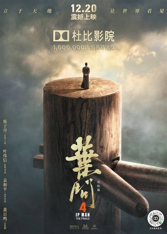电影《叶问4》近日发布了一张杜比影院海报。咏春拳的木人桩被放大数倍,矗立天地之间,而甄子丹饰演的叶问宗师则站在桩上,立于云端。海报语“让世界看见”为双关,既暗示叶问这回将让全世界见识咏春功夫,也突出了杜比影院相当于普通影厅500倍的超高画面对比度。