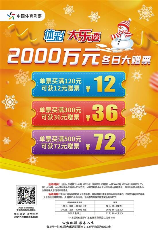 此次活动具体规则为,单票单期投注额120元至299元,可获得12元赠票;单票单期投注额300元至499元,可获得36元赠票;单票单期投注额500元及以上,可获得72元赠票。