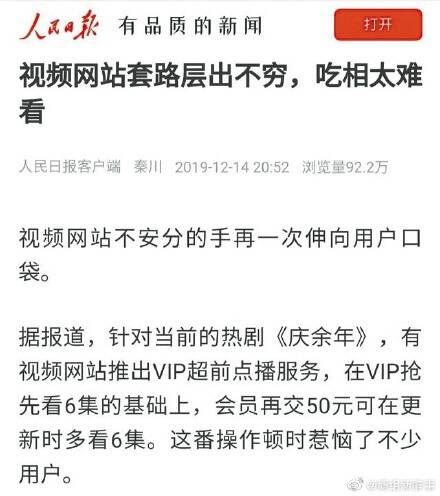 而让观众始料不及的是,这次《庆余年》才播了不到一半,播出平台就开始“割韭菜”了。消息一发布,很快就被网友骂上了热搜榜首。网友纷纷表示,这种利用观众追剧心理“坐地起价”的做法太不地道:“我已经充了会员费,为什么还要另外付费?”