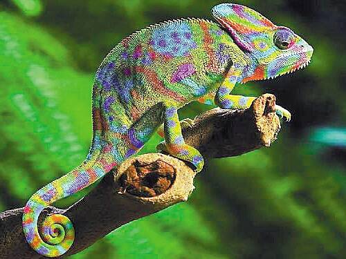 杜学敏介绍,变色龙能通过改变肤色来表达情绪,是因为变色龙皮肤中有这样一些周期性排列的小颗粒,当变色龙情绪变化时,它就通过皮肤的收缩与舒张来改变皮肤中周期结构的距离,进而改变肤色。比如,当变色龙情绪平静的时候,皮肤中小颗粒间的距离排列非常紧密,这时皮肤呈现绿色;当变色龙兴奋激动的时候,皮肤会舒张进而使得紧密排列的颗粒距离增大,这时用肉眼来看,它的皮肤就会从绿色变为橙色。