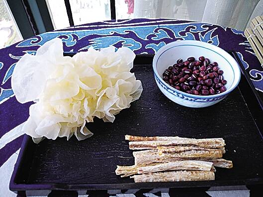 【材料】北沙参30克,玉竹30克,红豆100克,干品雪耳30克,冰糖和马蹄粉适量。