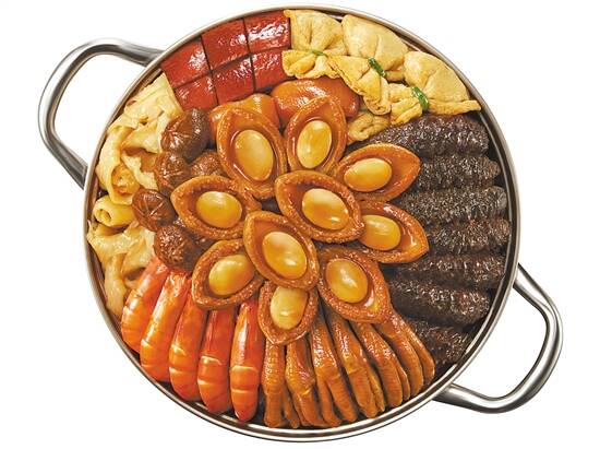 聚宝盆系列盆菜提供4-6人份和8-10人份两款盆菜供大家选择,元宝大鲍鱼、南美大白虾、特级越南花胶、湖北靓花菇等十余种山珍海味经过烹制后,按味道从淡到浓一层一层码好,其味道相互渗透,层层入味,你中有我,我中有你,食材滋补亦很实在。