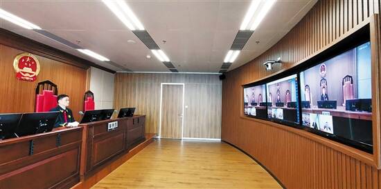 广州互联网法院的法庭里,审判席的对面是竖起的三块高清大屏幕,画面上显示原、被告双方分别在广州、江门登录上线,而同时在线的还有2500余名类案当事人和1000余名在线围观人员。