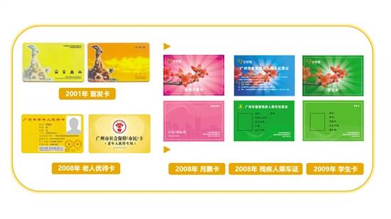 自2001年发行第一张普通储值卡,羊城通相继推出月票卡、老年人优待卡、残疾人乘车优惠证、学生卡,到近年来发行的记名卡、乘车二维码、虚拟卡、旅游云卡、出行金等互联网产品异彩纷呈。