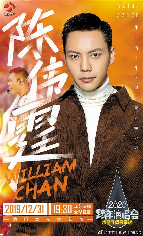 往年演唱水准数一数二的江苏卫视跨年演唱会,今次将于2019年12月31日19:30在澳门金光综艺馆举行,跨年口号是“用奋斗点亮幸福”。近日,演唱会全部嘉宾阵容公布,其中有流量新星,也有实力唱将,阵容包括陈伟霆、欧阳娜娜、张韶涵、谢霆锋、薛之谦、刘维、周华健、潘玮柏、冯提莫、孙燕姿、蔡徐坤、朴树、谭维维、董宝石、邓紫棋、杨和苏、张杰、李宇春、王力宏等。