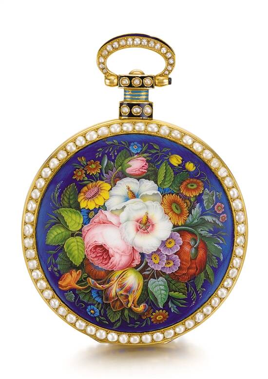 2019年7月,苏富比启动了“时间杰作”系列拍卖会,计划在全球四大拍卖城市举办四场古董钟表拍卖会。在伦敦举办的首场中就有一只“百花图”(如下图),以蓝色半透明珐琅为地儿,中心位置是玫瑰、扶桑花和郁金香等,周边布满了枝叶并且夹杂着各种小花。花卉的色彩艳丽,对比强烈,整个画面体现了微绘珐琅师高超的技艺,要知道,这可是在不到6个厘米的直径内所完成的画作啊!难怪这类表在整个19世纪都将是中国人的最爱,尤其是《品花宝鉴》中出现的“大八件”表,更是将“百花不露地”发挥到了极致……请看下回详解。