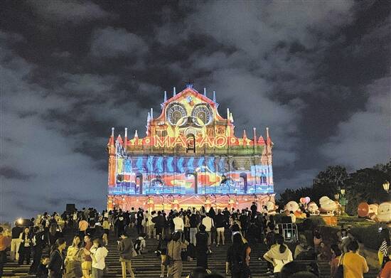 大三巴牌坊前,游客在观赏灯光表演 新华社记者 安希雅 摄