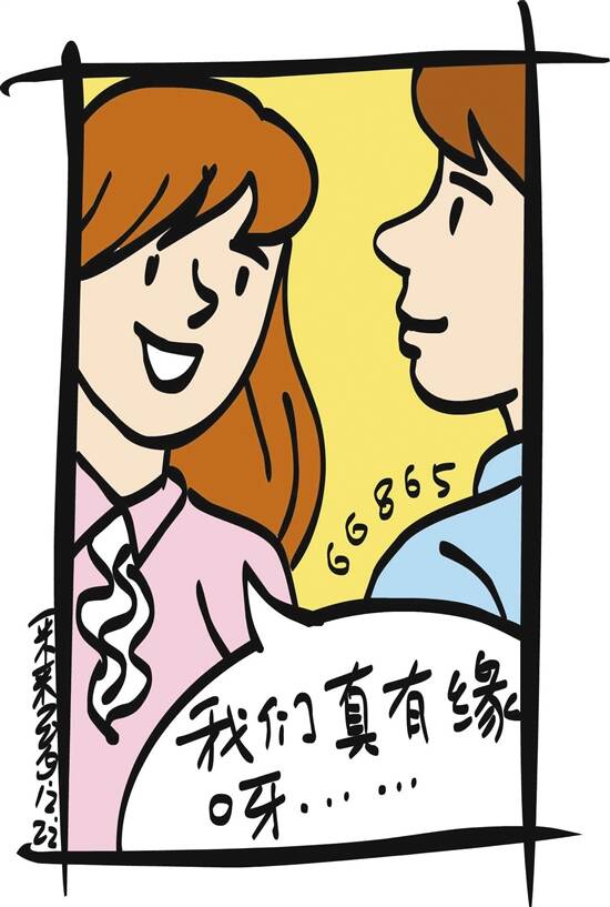 索萦看到谷成这个名字,心想,不会这么巧又是他吧。她拨打了对方电话,很快,谷成带着皮包来了,索萦一眼就认出他正是她公园里相亲时的谷成。她柔声地说:“我们真有缘呀。”他说:“皮包里2万元现金和5张中了二等奖的彩票全部归还你。 ” (杨进峰)
