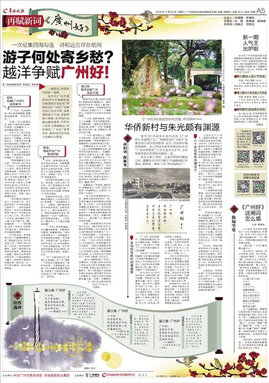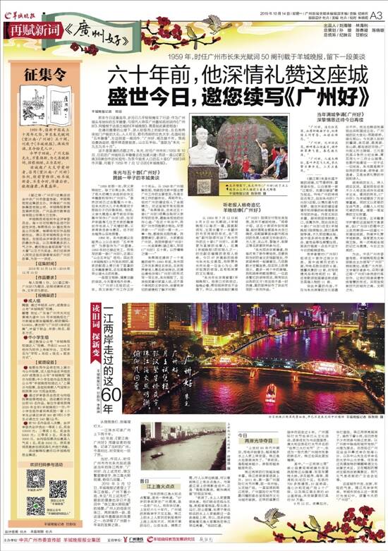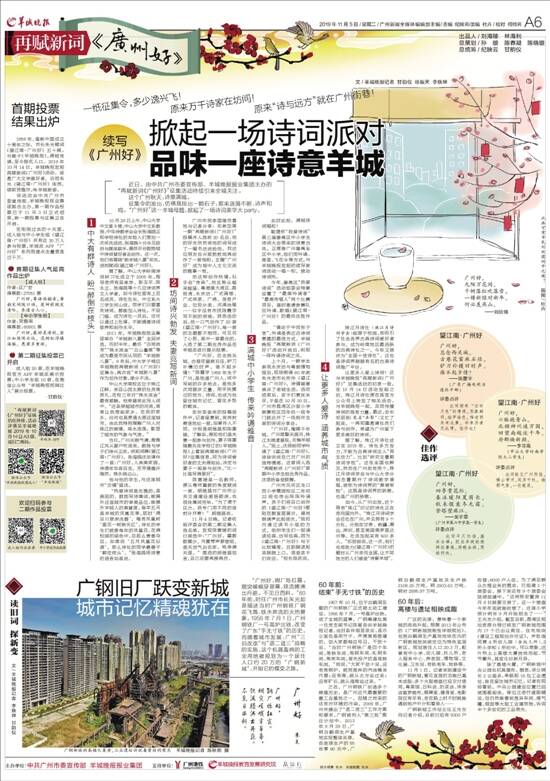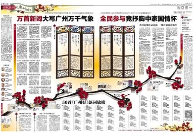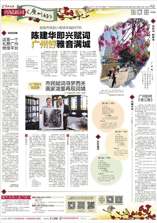 像再赋新词《广州好》这样的诗词征集活动,为什么会出现在广州?首先是广州有这个基础,朱光老市长曾写50首《广州好》,当时引起全城称赞。羊城晚报再赋新词《广州好》征集活动是借朱光老市长的题目,发动大家用诗词的方式书写广州,这在全国我是没有看到的。