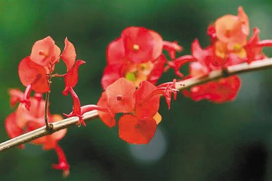 文/李文艳 图/邓新华一丛红艳艳的灌木,稀疏的绿叶和浓密的圆盘形红花,随着修长的蔓性枝条向外伸展。这就是冬红。它的聚伞花序常由2-6个再组成一个圆锥状。膜质的花萼朱红色或橙红色,由基部向上扩展成一直径可达2厘米的小圆盘,像“雨巷”中的油纸伞,又像别致的小红帽。因此它又称阳伞花、帽子花。